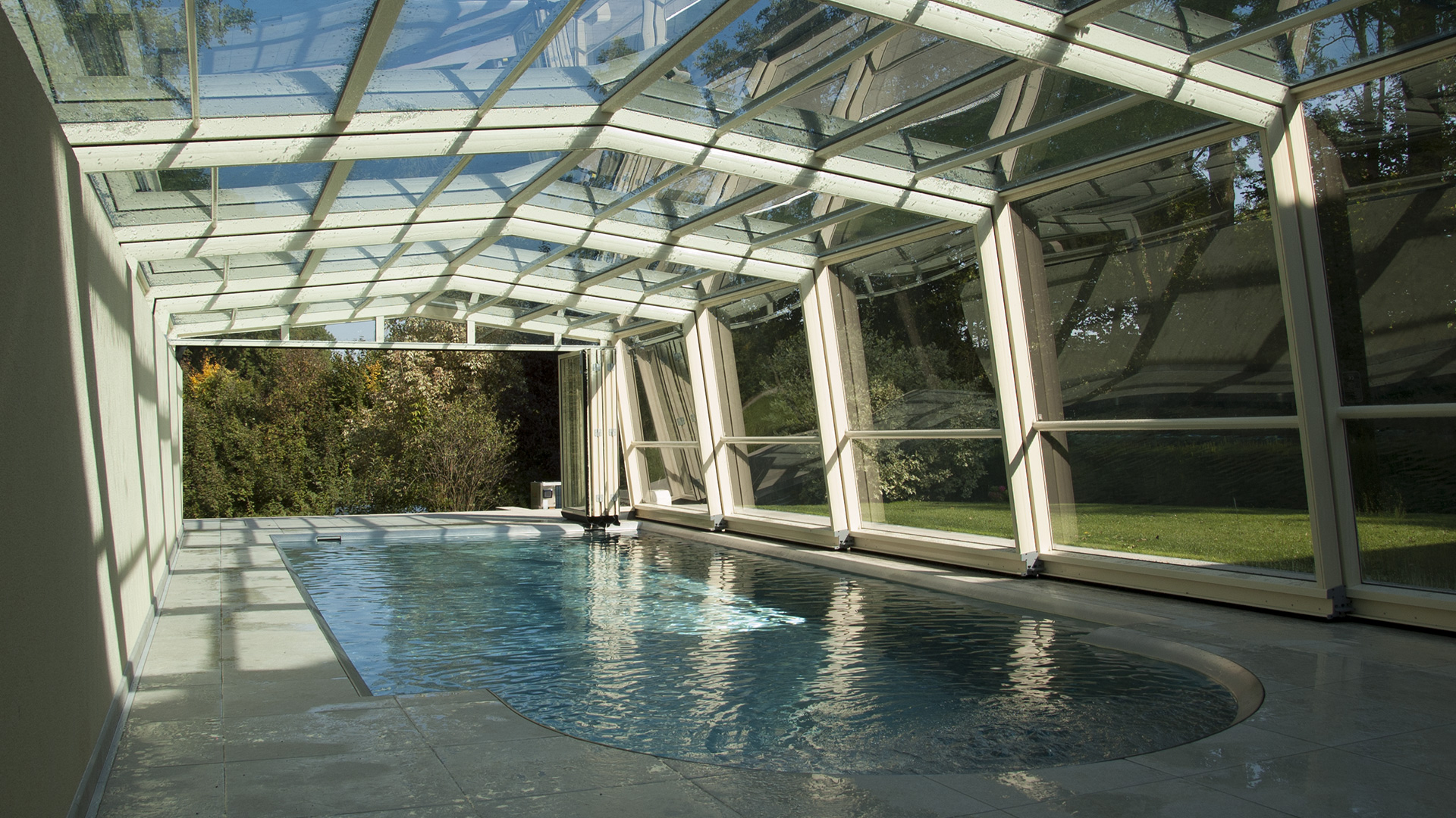 Einzigartig ist die Akkordeonwand, die einen barrierefreien Zugang zu Ihrem Schwimmbecken ermöglicht, sich variabel öffnen lässt, ohne mühsames Schwenken der gesamten Wand.